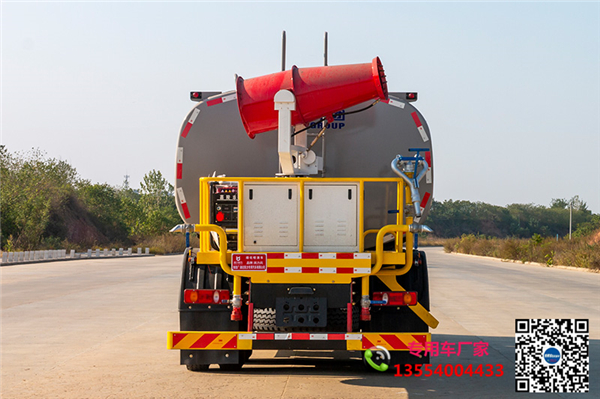 专用部分配专用洒水泵,带前冲、后洒、侧喷、后工作平台及洒水高压炮。配消防接口、自流阀,2根与罐体等长输水管,水位计,1个爬梯,两侧及后杠。煤场堆料区采用旋转喷枪矩阵,实现360°无死角抑尘覆盖?