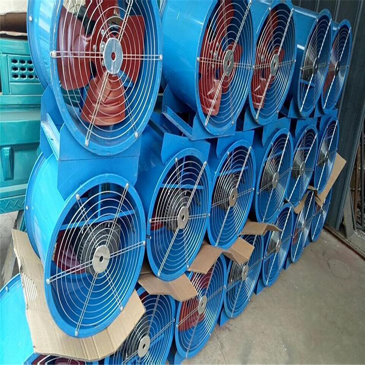 本系列产品按叶轮直径不同共分为十三种机号,依次排列为№2.8、3.15、3.55、4、4.5、5、5.6、6.3、7.1、8、9、10、11.2等。每一种机号叶片又可安装15°、20°、25°、30°、35°五种角度。该风机可制作普通、防爆二种。本系列产品均用叶轮直接装在电机轴上的直联结构。在叶轮圆周速度不超过60米/秒条件下配用三种转速:2900、1450、960转/分。而对进风口方向看叶轮为逆时针转动,进气方向在叶轮端。叶轮部:由叶片和轮壳组成,防爆轴流风机叶片由玻璃钢压制而成,且按选定之安装角度于轮彀上。普通轴流风机叶是铁叶片