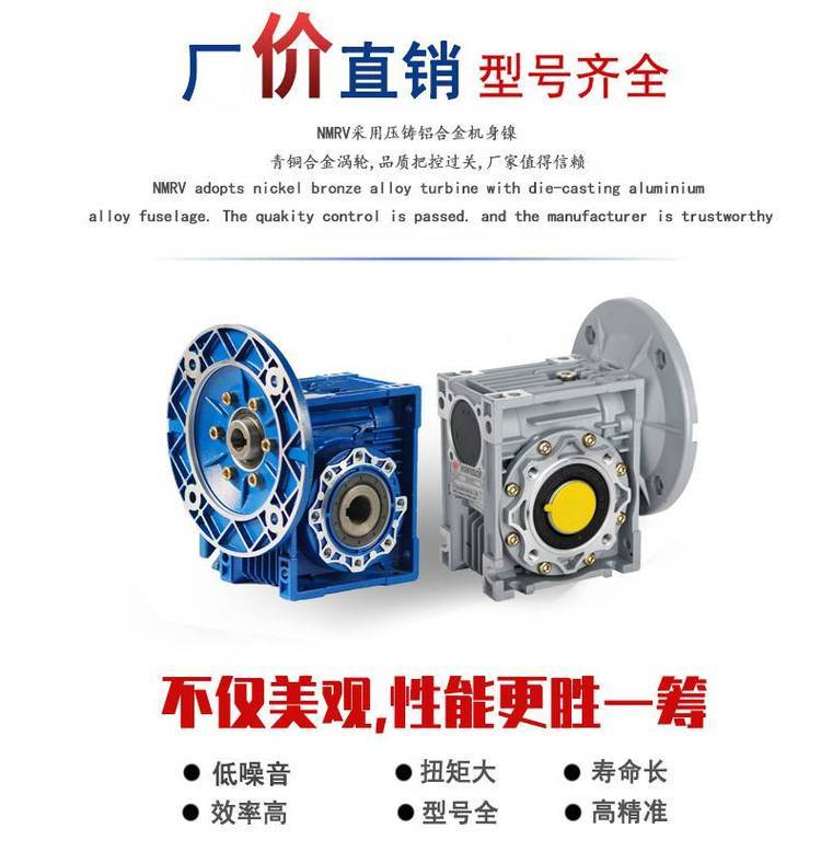 1、NMRV减速机的重量轻,外壳采用铝合金铸造,具有重量轻,强度优越,观精美,散热性能高,使用寿命长,动作无噪音等特长,与电机连接方便简单。