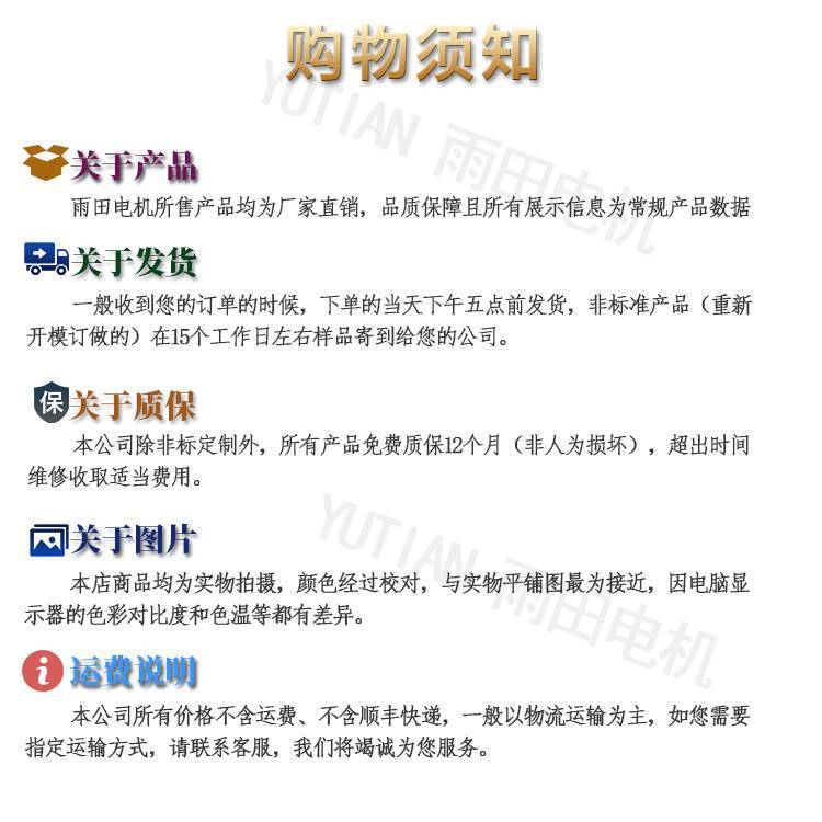 1、非人为情况下雨田(YUTIAN)电机承诺7天包退,15天包换,亲"您"可以放心选购。