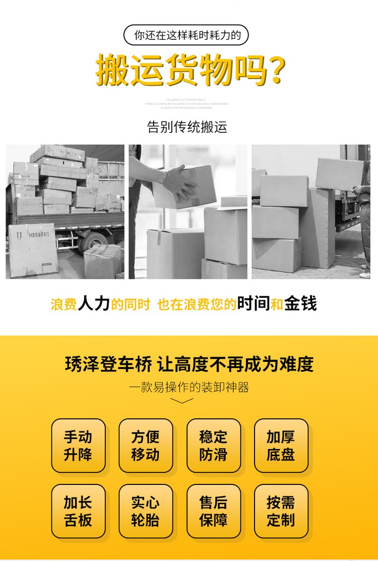 移动登车桥是与叉车配合使用的货物装卸专用辅助设备,有了它,叉车能直接从地面使人汽车车厢内部进行批量装卸作业,产品采用人工液压动力,不需再接动力电源,只需单人操作,即可实现货物的快速装卸,它可以使企业减少大量劳动力,成倍提高装卸作业效率,让使用公司获取更大的经济效益。