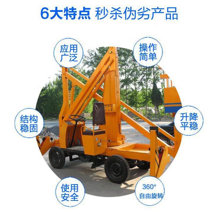 曲臂升降平台360度旋转无需外接电源,可跨越障碍物工作,升降平稳安全的曲臂式升降平台,采用折臂式工作臂,作业的范围和空间不受限制。