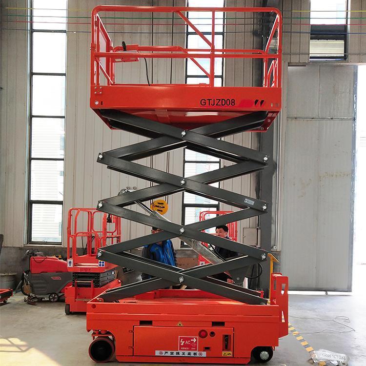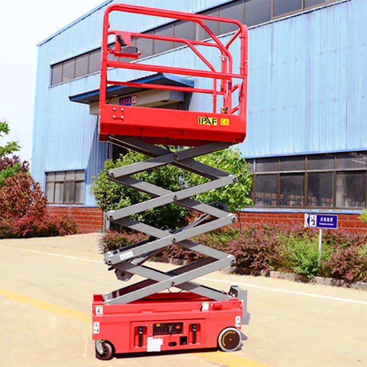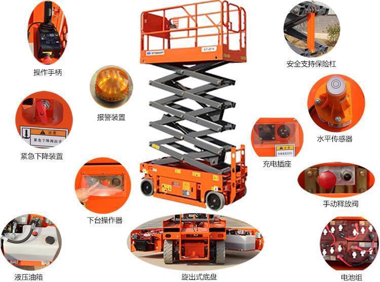 自行式液压升降机具有自动行走功能,能够在不同工作状态下,不需外接电源,不需外来动力牵引即可升降自如,而设备的行走转向也只需一人便可完成。液压轮可以90°转向,升降平台工作台面可以延伸90cm