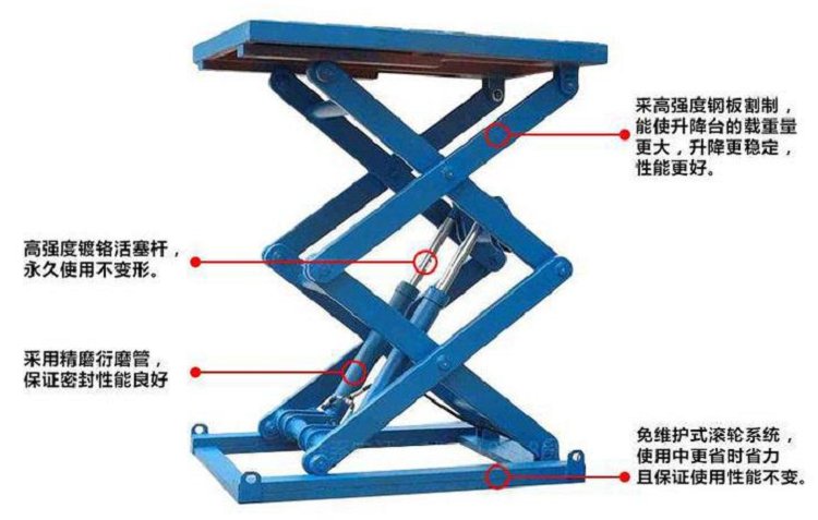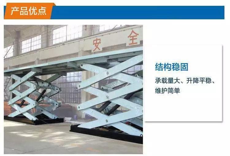 固定剪叉式其主要适用于仓库、车间与汽车、货柜之间的货物装卸,无需设置货台、钢架,直接从地面起升装卸。可根据客户现场环境或提供的数据订做,根据升高可分为单剪叉式、双剪叉式,多剪叉式及双跨式。升降机根据载重来匹配相应大小壁厚的矩形管做支架;相应大小流量的液压泵站做动力单元;相应大小缸径的油缸做动力载体。根据使用的频率可换装无油自润滑铜套及相应配件。固定装卸平台结构简单,平台表面可设检修口,易于维修保养。控制箱设有上升、下降、急停三个按钮,易于操作,也可加装脚踏开关。越来越多的人性化改进,使固定装卸平台的使用范围越来越广。