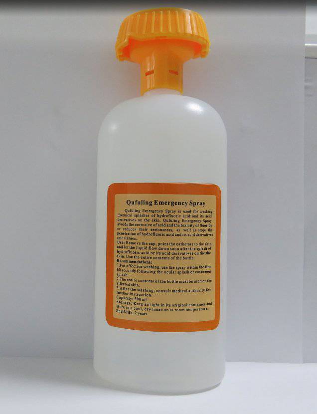 2021500ml六氟灵应急冲洗液 HF冲洗液技术参数:针对氢氟酸及其酸性衍生物喷溅后对眼睛或皮肤的紧急清洗产品,可用于消除或减轻酸的腐蚀性和氟的有毒性,并同时阻止氢氟酸及其酸性衍生物在皮肤组织中的渗透。有效期两年。容量:500ml