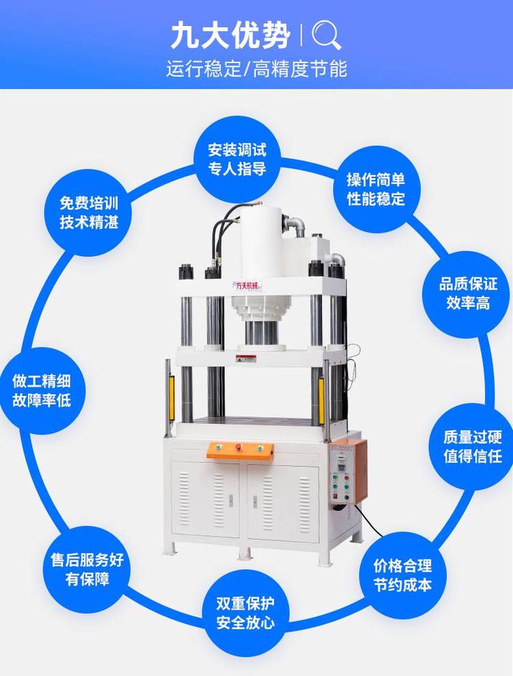 1.该系列四柱快速油压机以3-200MPA液体压力作为动力源,采用快速子母缸液压回路,噪音小、油温低等特点;