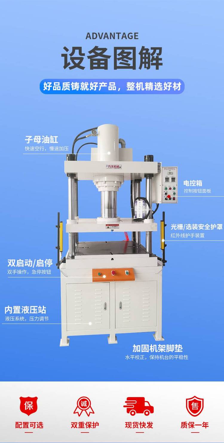 1.该系列四柱快速油压机以3-200MPA液体压力作为动力源,采用快速子母缸液压回路,噪音小、油温低等特点;
