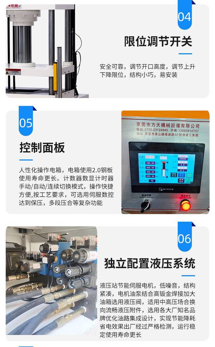 4.控制系统使用PLC编程控制,压力、行程、速度、保压时间、闭合高度均可按需求调整,方便操作;
