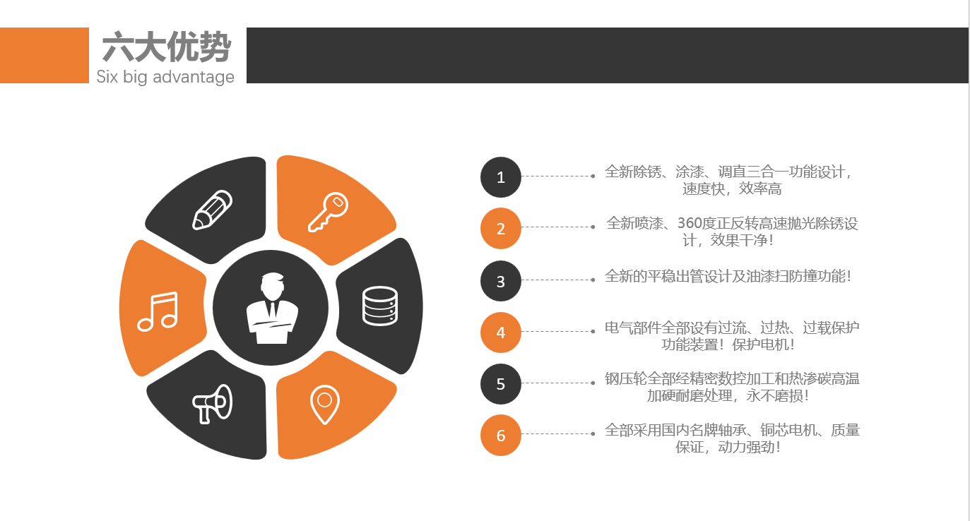 2﹑本机多功能一体化,一次性完成钢管调直﹑除锈﹑涂漆多项操作。对钢管无损伤拉长现象,省时﹑省力﹑高效﹑环保。