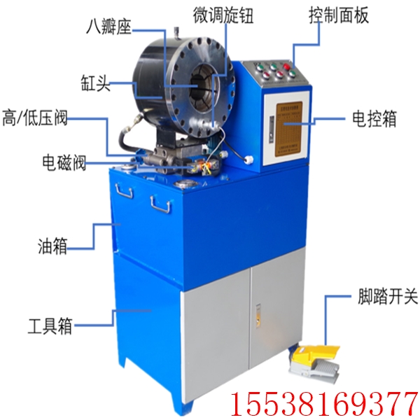 油泵在电机驱动下,输出液压油,推动液压缸里的活塞做左右往复运动,从而使压块推动模座,使模座能产生径向收缩,终实现模块对胶管的扣压。当收缩量达到在控制面板上所设定的值时,扣压自动停止,换向阀自动换向,液压油进入油缸下腔,带动上方板向上运动,使模具孔张大,就可以取下扣压好的胶管总成。