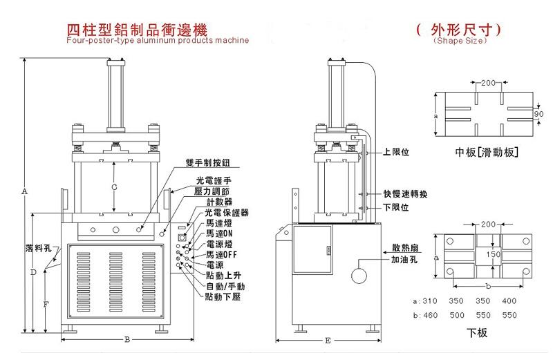 本系列压铸件冲边油压机是各类铝、镁合金压铸制品的毛边冲切,塑料制品的整切;也适用于塑性材料的成形如板料的落料、拉伸等、是普通型的升级产品, 采用先进的子母缸液压回路.无论是噪音,速度, 耗电功率,均优于普通液压冲床是款高效率高速度,高出力,高环保的新一代液压冲床本机在压铸行业应用为广泛.