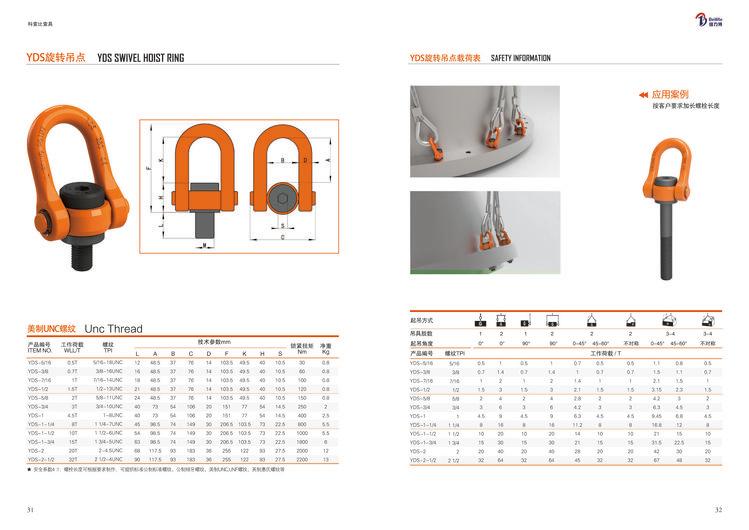 YDS旋转吊环 起重旋转吊环 翻转模具吊环 模具翻转吊环 模具吊环厂家 M12DSS吊环,倍力特厂家-科索比索具(天津)有限公司,YDS旋转吊环和DSS旋转吊环的外形比较接近,属于两款吨位较大的吊环产品,VWBG万向吊环倍力特品牌万向旋转吊点等,M8,M10,M12,M14,M16,M18,M20,M24,M30,M36,M42,M48,M56,M64,M72,M80,M90,M100还有美制5/16-18UNC,3/8-16UNC,7/16-14UNC,1/2-13UNC,5/8-11UNC,3/4-10UNC,1-8UNC,1-1/4-7UNC,1-1/2-6UNC,1-3/4-5UNC,2-4.5UNC,2-1/2-4UNC,各种规格YDS旋转吊环都有现货,可以任意做加长螺栓,非标螺栓等。VWBG万向吊环YOKE万向旋转吊环8-231,台湾YOKE是吊环品牌中比较受到大家认可的一款吊环产品,侧向旋转吊环、眼型旋转吊环、垂直旋转吊环、翻转吊环等。天津科索比索具所有规格都有现货,通过物流或者快递发往客户手上。
