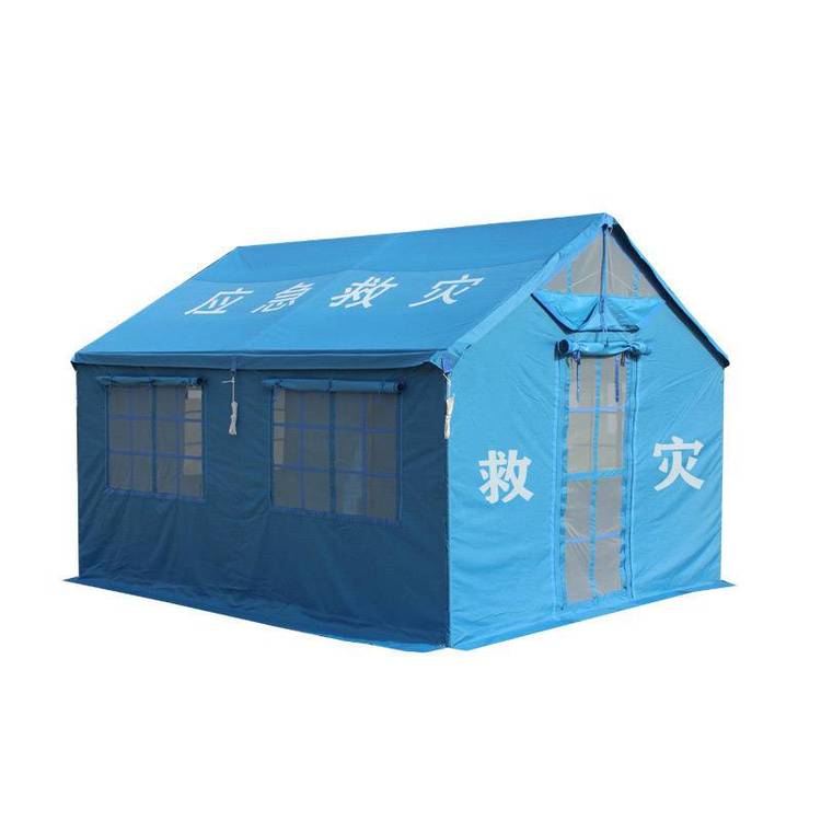 帐篷为长方形双坡面直立墙建筑样式,开门山墙上开三角窗一个,开窗山墙开三角窗一个,方形窗一个,两侧墙各开方形窗户两个。侧墙可以支起成阳篷,整体帐篷通过拉绳拉起,用三角桩加固。篷架为插接式框架结构,柱底四周全部设有落地横杆。能在自重和8级风力荷载作用下安全使用。