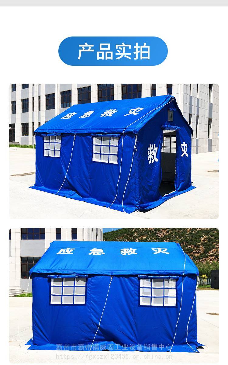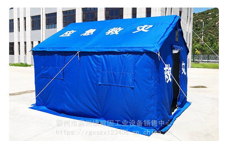 篷体颜色为天蓝色,印有“应急救灾”白色字样;