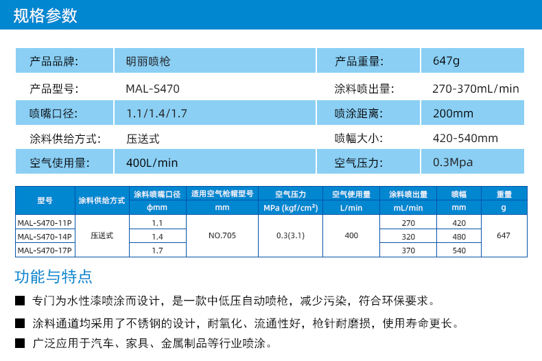 明丽MAL-S470喷枪皮革塑胶喷漆线水性漆涂料用不锈钢自动喷漆枪