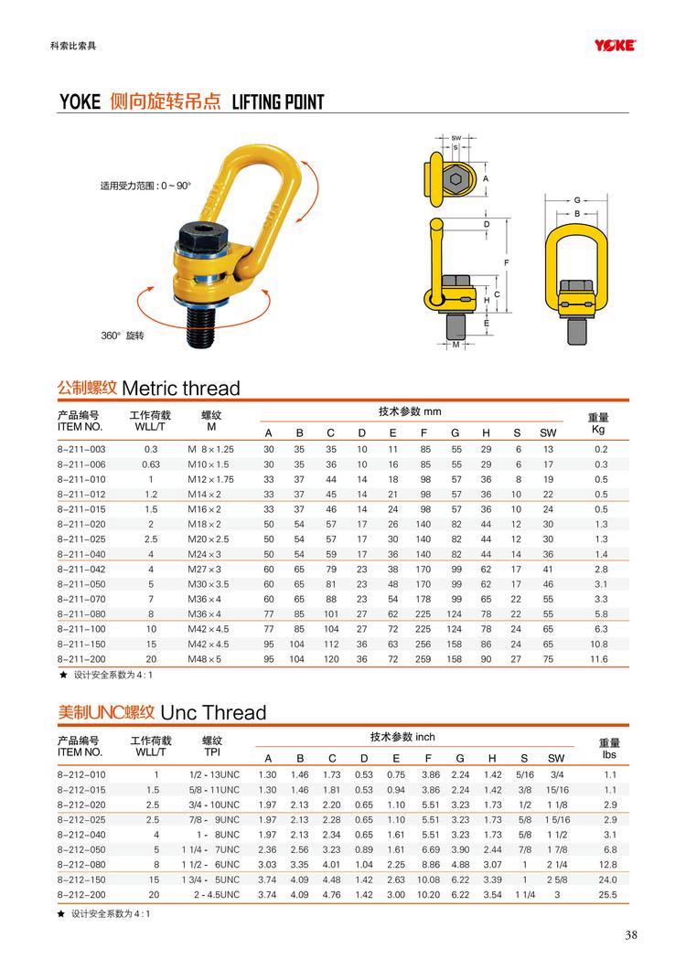 侧拉吊环采用合金钢材质,所有锻造件以及帽螺栓上都印有批次编号,以便于在质量认证书上进行检查核对。起重吊环均可360度全周旋转,且具有180度支点绕轴旋转功能。(表面达克罗处理)增加了产品的抗腐蚀性能。螺栓为统一标准粗牙螺纹,规格为满足ASTM A 574标准的内六角合金角头螺栓。验证载荷为较高工作载荷的2.5倍,以1.5倍极限工作载荷的作用力进行20000次的疲劳极限测试,垂直翻转达到,限定量大角度90度产品全部磁粉探伤检验。