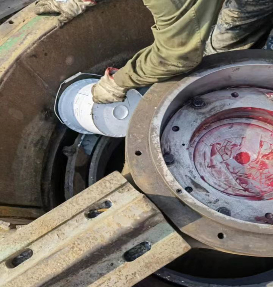 1、清理准备:用乙炔火焰烧蚀切割掉椎体表面残余的填料,用砂轮或砂纸打磨椎体表面,去除残留或铁锈,用干净抹布擦拭表面粉尘,后必须用擦拭去电粉尘和油污。装合椎体和衬板,如果椎体底部和衬板配合面有间隙,用腻子封住以防漏胶。
