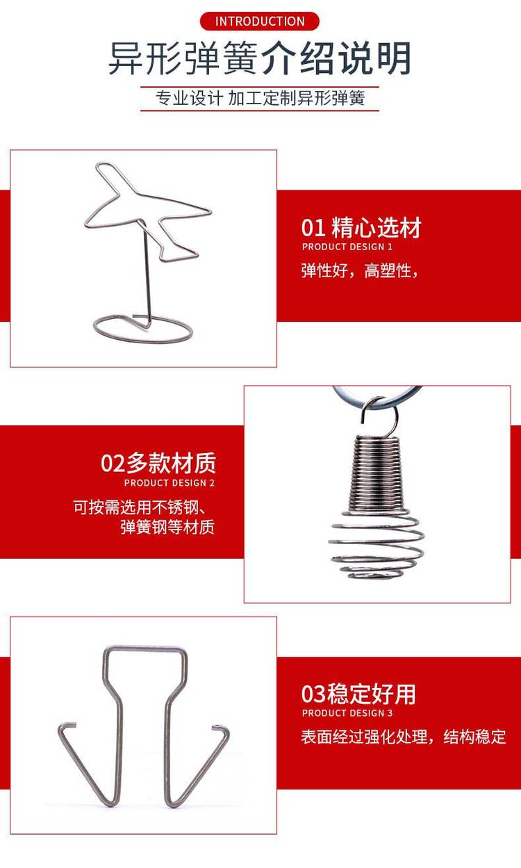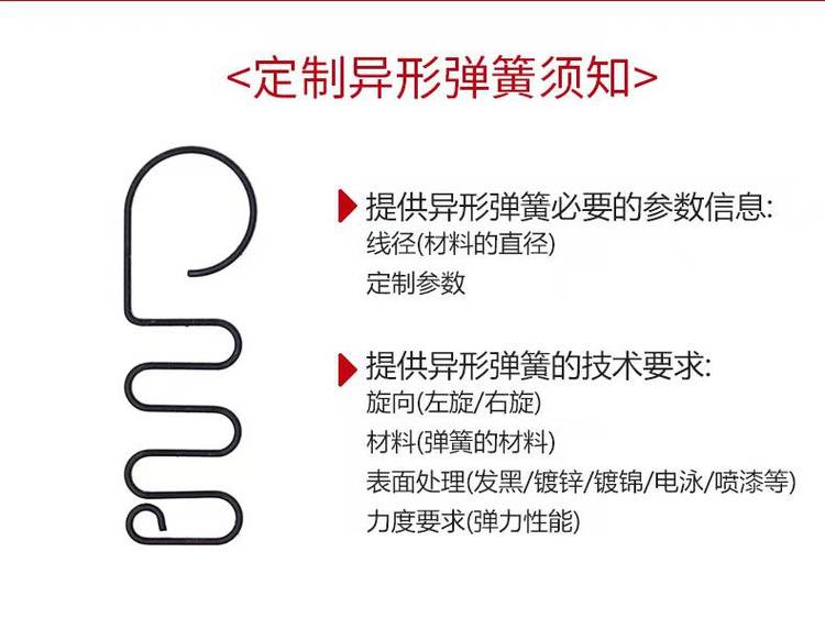 异形弹簧:与常规弹簧稍有区别就是弹簧本身是不规则的,有弯曲和多复杂的角度设计·而制造加工手艺也是相对有要求,设备也是比较有要求·是电脑机绕制·因绕制角度多,折弯多,所以生产速度慢。