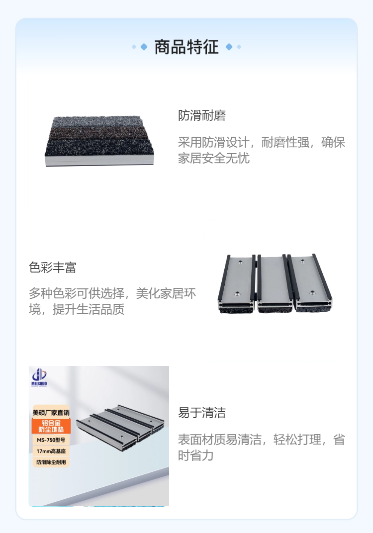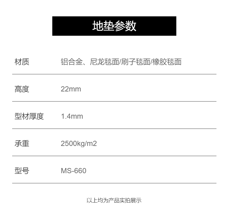 特点 | 承重能力好/凹槽安装/表面材料可为地毯或橡胶/可卷起,方便清洁铺垫槽/垂直或斜角框架可用 | ||