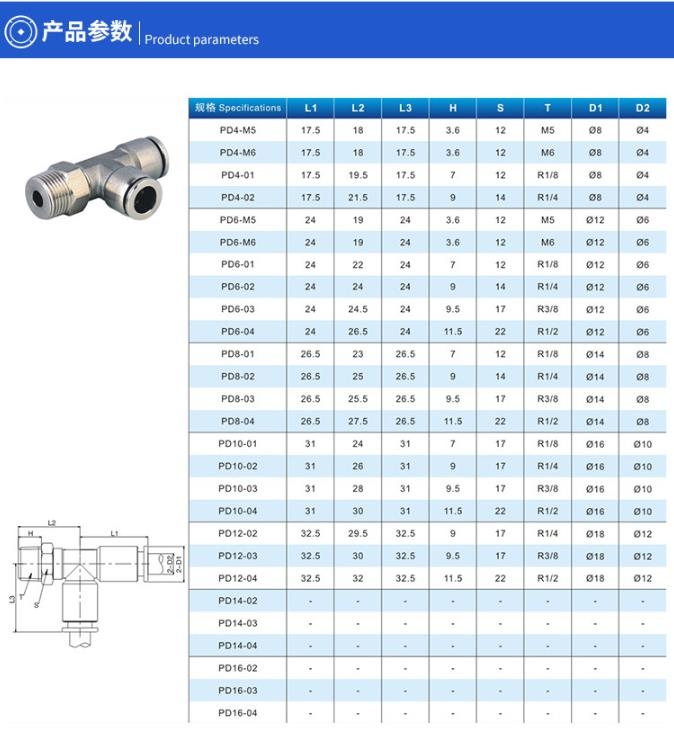 不锈钢侧螺纹快插三通PD气源转换快速接头
