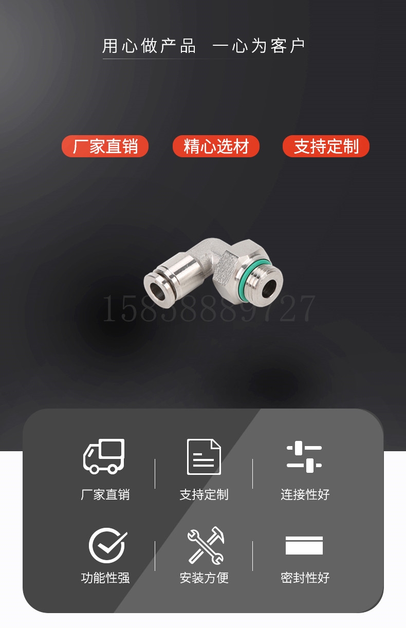 不锈钢气动快插G牙弯头 不锈钢外丝快插弯头适用范围: 一般工业,汽车工业,矿业,造船工业,适用范围 一般工业,汽车工业,矿业,造船工业,酸,碱液,气体,水,油等。