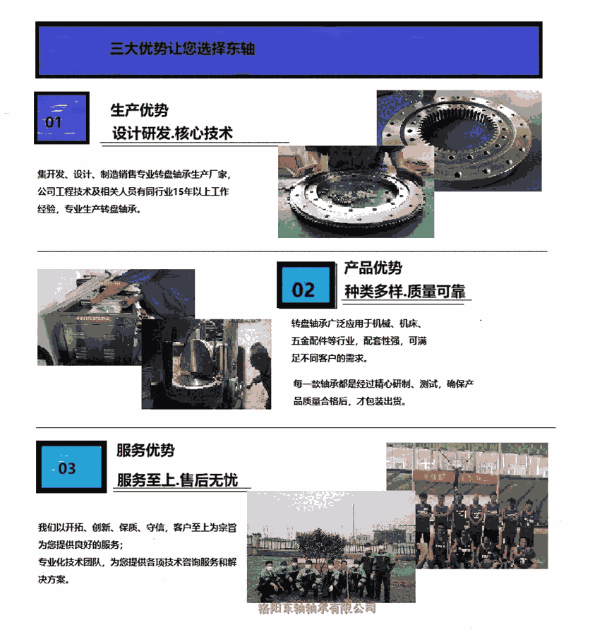 洛阳东轴轴承有限公司(LYDZ)主要产品有精密转盘轴承, 精密交叉圆柱滚子轴承、精密交叉圆锥滚子轴承、等截面薄壁球轴承、YRT转台轴承、ZKLDF高精度推力角接触球轴承、精密角接触球轴承、机器人专用轴承、推力球轴承等,精度可以达到P4、P2级别;具有精度高,使用、维护方便,成本低廉,交货周期短、高性价比等特点,广泛适用于电子、医疗、能源、机床设备、试验设备、机器人及工业自动化设备。