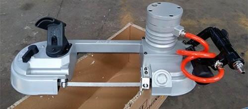 气动带锯特点:直切90°, 斜切45°,立式切割一体机。气动锯运转速度只有砂轮机的1/60,安全无火花。气动带锯床切缝窄0.5mm,切割表面平整,精度高,无挂渣,无脱碳。气动带锯的锯条使用寿命长,单位切割成本低,一根锯条使用寿命等同于50-80片砂轮切割片,较电能锯节能60% ,深受客户欢迎。矿用风动链锯 气动防爆带锯 煤矿用气动带式锯, 气动带锯DLY-10QS2