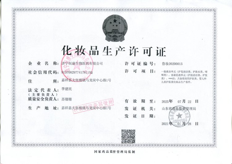 化妆品生产许可证 | 鲁妆20200015 | ||