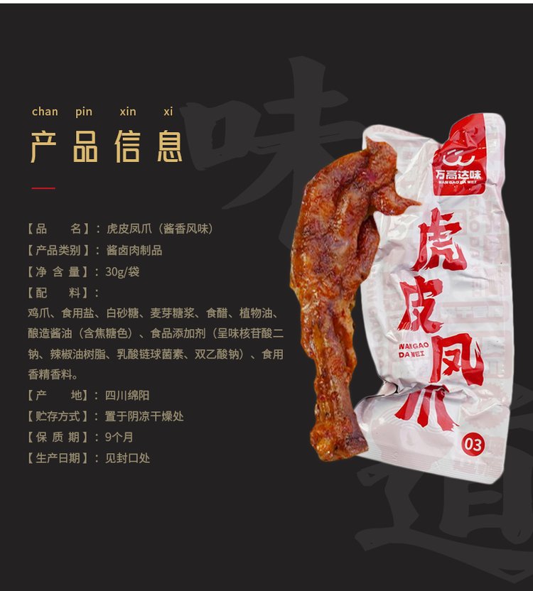 卤味虎皮凤爪30g/袋特色休闲夜宵零食五香鸡爪零食工厂批发 品牌 | 万高达味 | ||