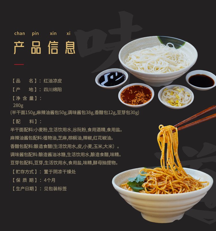 原料与配料 | 凉面、麻辣红油、醋、豆芽 | ||