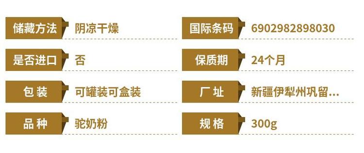 配料表 | 全脂驼乳粉、水解蛋黄粉、DHA、乳铁蛋白、叶酸、牛磺酸等 | ||