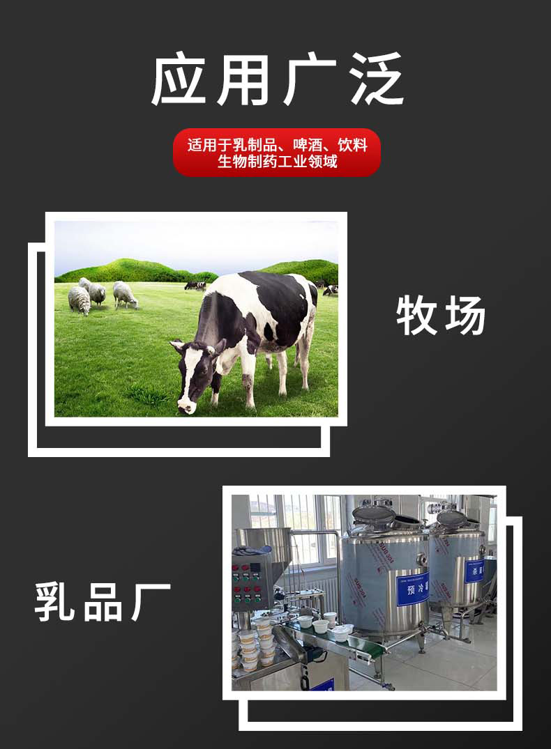 根据机组与罐体的连接方式,产品分为连体式和分体式;根据冷却方式,产品分为直冷式和间冷式。根据罐体形状,又可分为圆柱形立式、半圆形开启式、椭圆形封闭式。较常用的是椭圆形封闭式的牛奶冷却罐,也可根据用户要求设计和制造。