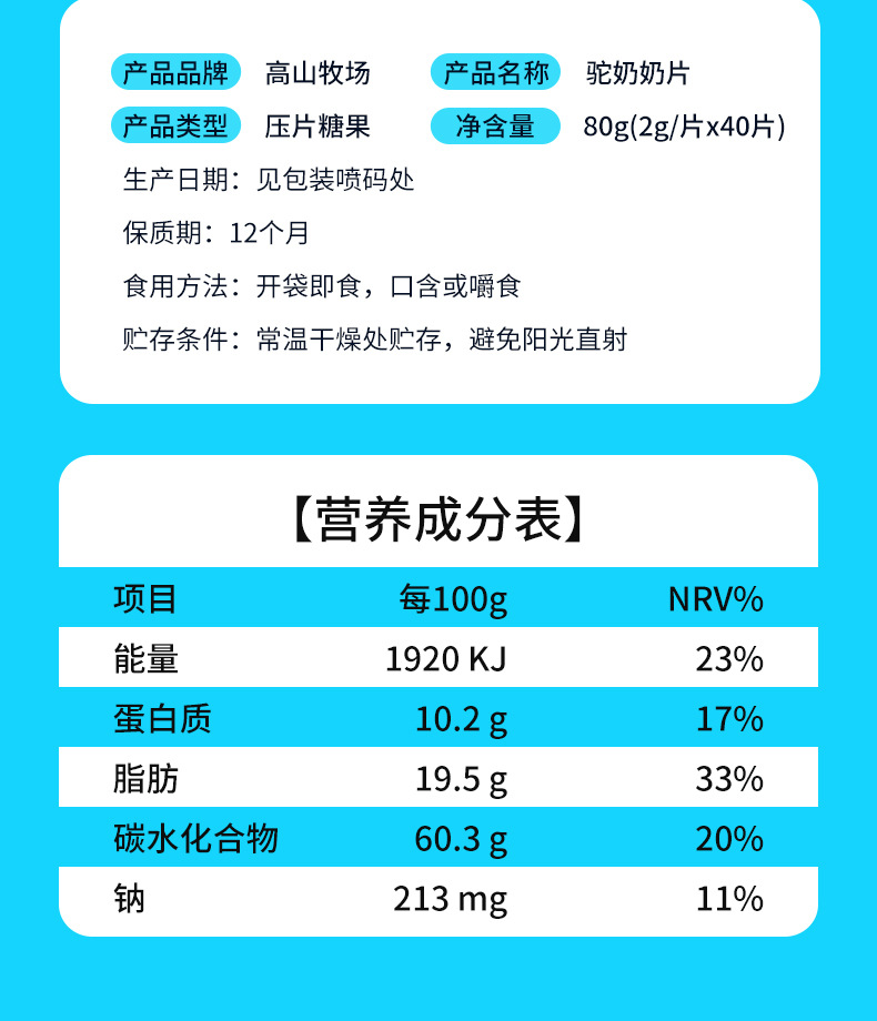 高山牧场 驼奶奶片 乳制品压片 2g每片 80g/袋 大袋装 保质期 | 360天 | ||