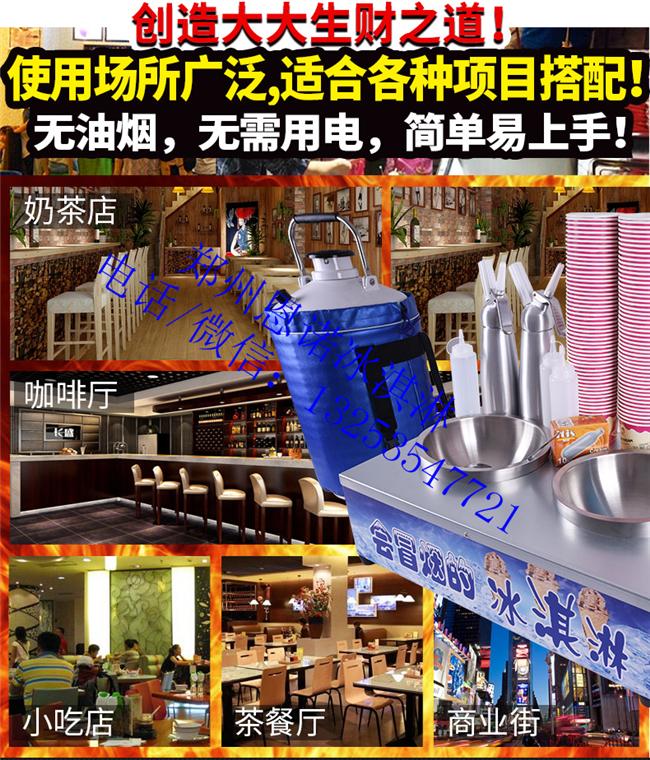 冒烟冰淇淋项目:包括整套所需所有特殊设备,工具、所需材料、广告布、促销录音,永久技术销售指导。避免恶性竞争,保护做此项目人人有钱赚,本项目严格实行区域保护,一个城市1-2家做,让你赚翻整个夏季! 本项目特点: 1.不需要电源、不用电器 2.一个人可以操作 3.方便携带(有电动车就可以) 4.操作简单 容易上手 5.本小利大(做出一份成本1元左右 卖5元-10元) 6.销售面广人群广泛、夜市、公园,学校门口,步行街、乡镇、人人见了都想品尝! 7.付款后教你做几十种做法(冰淇淋,冷饮等等) 8.区域保护 当地只给你一个人发货 9.技术成熟、无毒健康 口味独特、吃法新奇,好吃好玩。 10.现做现卖,立等可取,不需要担心囤货,隔夜。 所谓的“液氮冰淇淋”并不仅仅是一种噱头,从物理原理上,也能找到相应的解释:冰淇淋的口感取决于其内部的结构,如果把冰淇淋放大到一定倍数之后,就可以发现其结构间有很多的气孔。气孔与气孔的间隙里存有介质和冰晶。其中,介质的主要成分是糖和蛋白质,而冰晶是口感的关键因素。口感要好,冰晶一是要多,二是要小。普通的制冷方式,由于制冷速度较慢,因此在制冷的过程当中,冰晶会慢慢“长大”。而液氮作为最快的制冷方式,其冷冻过程可以急速地穿越过冰晶的生长期,使冰晶失去了“长大”机会;此外,通过不断搅拌,还可以形成很多结晶的位点。双管齐下,这样一来,就保证了冰淇淋口味的细腻绵软。 液氮的沸点是零下320度,当它迅速蒸发时,仿佛施了魔法一般,会释放出剧烈的烟雾.待雾开云散,冰淇淋也完成了急速成形,这时候,顾客便可以尽情享用了.相比传统冰淇淋,新鲜出炉的液氮冰淇淋的质感紧实,层次丰富,口感更佳,将液氮缓缓倒入搅拌好的奶油时,液氮在常温环境下立马发生汽化,在空气中迅速散开,形成大量白色烟雾。液态的食材瞬间凝固,可口的“分子冰淇淋”仅用两三分钟就能完成。冒烟冰淇淋机厂家直销-郑州恩诺商贸公司售多种冰淇淋机价格咨询电话/微信:13253547721(QQ:309877646)
