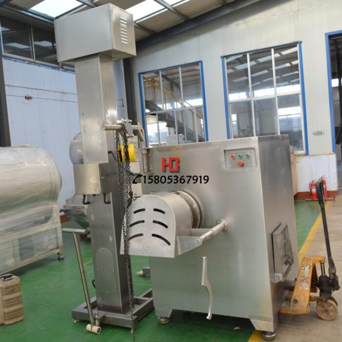 国外出口标配大型冻肉盘绞肉机 250绞肉机现货 冻肉盘绞肉机, 250绞肉机 300绞肉机生产厂家。冻肉绞肉机工作主要靠旋转的螺杆将料斗中的原料肉推挤到绞刀箱中的预切孔板处,利用转动的切刀刃和孔板眼刃形成的剪切作用将肉切碎,并在螺杆挤压力的作用下,将肉料不断排出孔板外。是肉食品加工中常用的一种切割机器,它可根据肉食品加工工艺要求,配用不同孔径的网眼板,把原料肉切割成多种大小不同的颗粒。