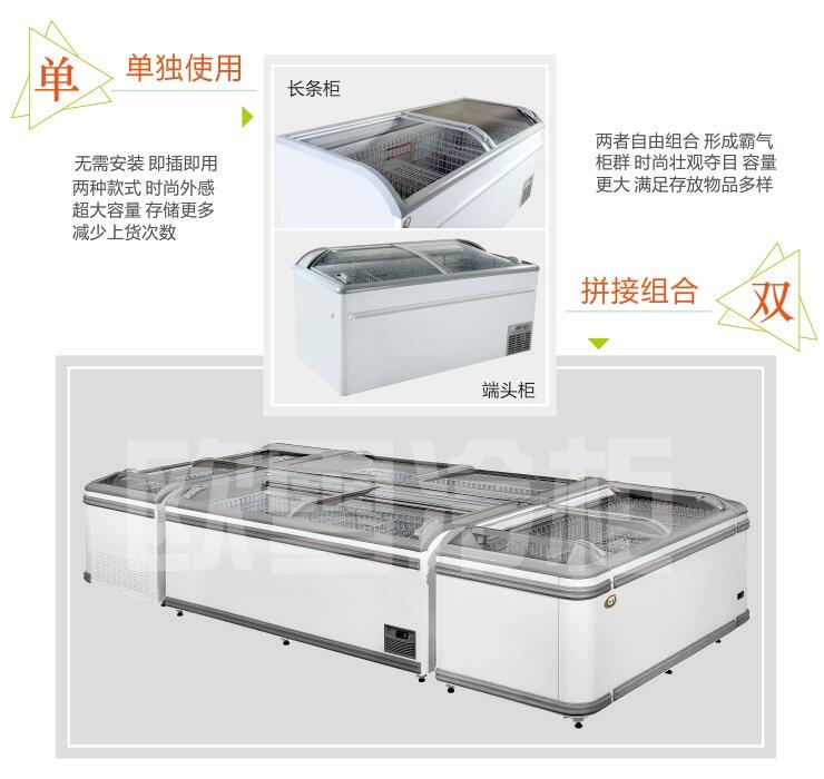 超市内使用的展示冷柜款式比较多,有冷藏保鲜的,也有冷冻的。一般冷冻的冷柜都是卧式组合岛柜比较多。多用来放置饺子、汤圆、雪糕类需要冷冻的产品。