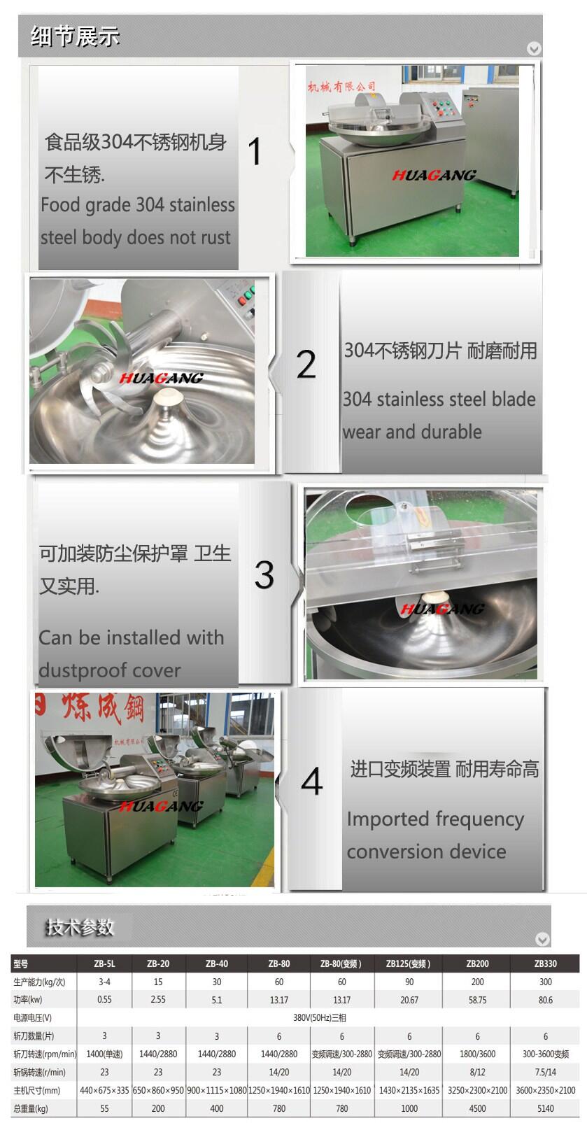 六把刀40L斩拌机定做款 我们先来看斩拌机的材质:斩拌机选用不锈钢作质料,其构造布局大方漂亮、在操作方面简单清洁,达国家仪器卫生标准技术领先、符合加工厂的操作,斩拌机的高速工作其特色能保证肉制品的斩切细度,发热小,斩切时间短,进步商品的弹性和出品率。斩刀选用进口经特别技术加工而成,斩锅为铸造全不锈钢原料。
