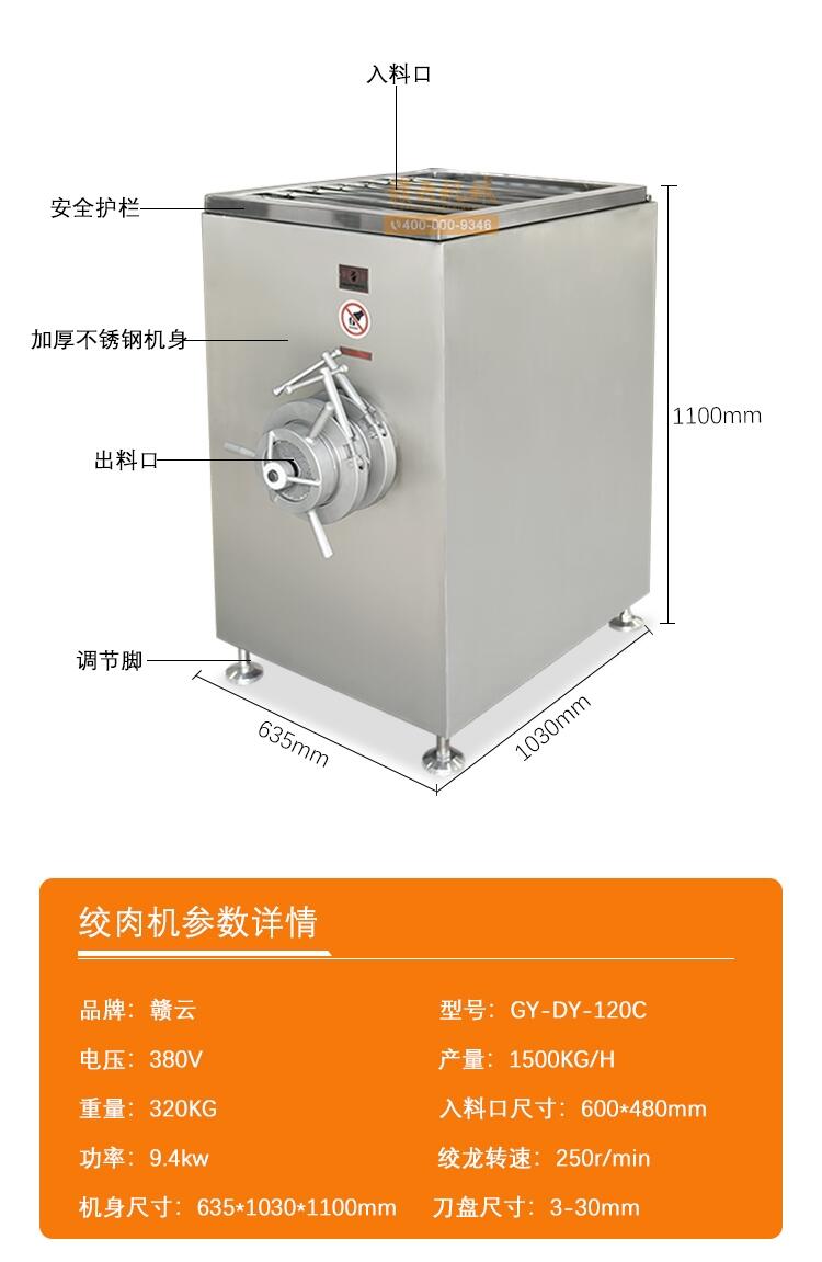 冻肉绞肉机依靠螺杆将料斗箱中的原料肉推到预切板处,通过螺杆的旋转作用,使得绞刀与孔板产生相对运动,从而将原料肉切成颗粒形状,以消除原料肉种类、软硬、纤维粗细不同的缺陷,确保了肉馅的均匀性.冻肉肉机主体全部采用不锈钢制作,设备结构合理、造型美观、机械性能稳定可靠、清洁卫生、噪音小。该机可以绞冻肉、带骨鸡架、冻鱼。用户可根据工艺要求选配不同规格的孔板,加工出理想的肉馅,以满足不同肉制品的加工需要,是替代进口同类产品的选择。