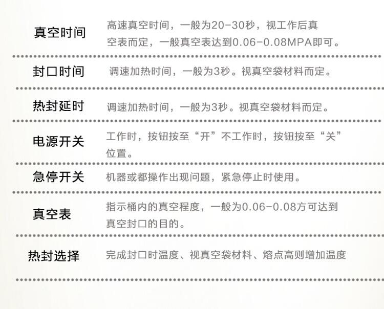 1.功能:该机械可将包装袋内抽成真空后、立即自动封口,袋内真空度高,残留空气少,防止了细菌等微生物的繁殖、避免了物品氧化霉变和腐败、同时对某些松软的物品、经人包装后、可缩小包装体积、便于运输和贮存。