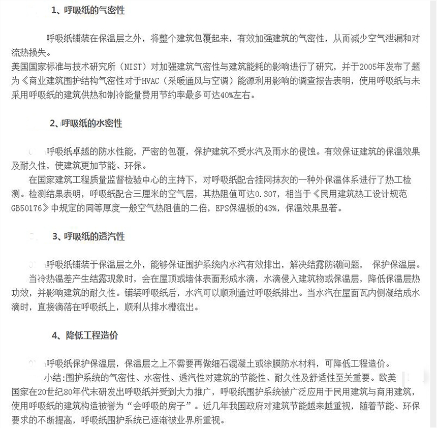 呼吸纸能提供很佳的水和空气的隔离与水蒸汽透过的平衡调节,他可以减少外部的水汽进入墙壁缝隙的机会,并同时让建筑内部的湿气得以从墙体中散逸出去,效避免霉菌和冷凝水在墙体及屋面中的生成,保证保温材料效能的发挥,从而达到节能、提高建筑耐久性的作用。