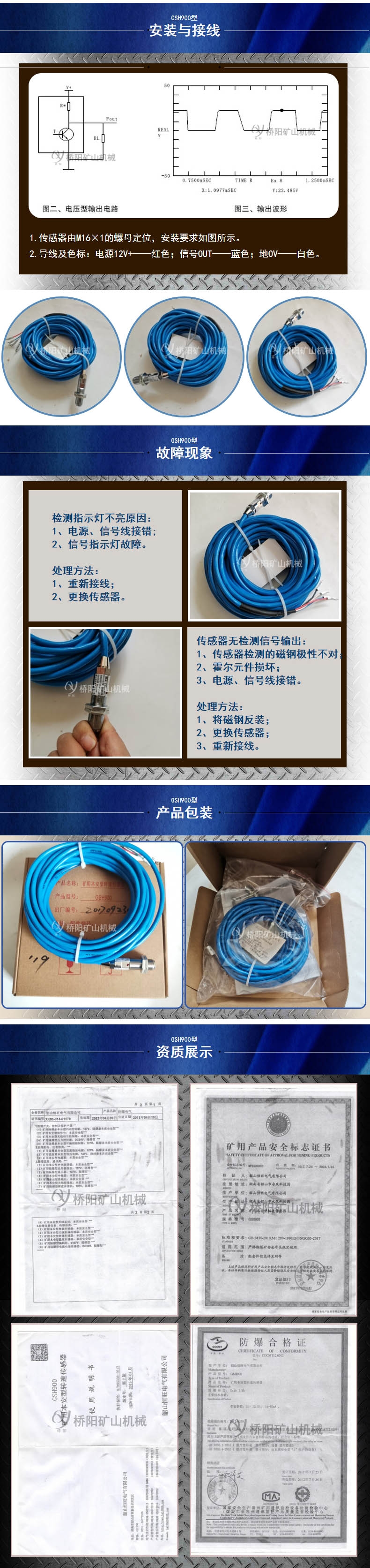 GSH900型转速传感器是霍尔开关集成电路,配以电源组合而成的霍尔磁敏电子传感器,它输入的磁信号,输出的是电信号,其输出的波形前后沿陡直,可以直接驱动晶体管,可控硅,继电器等小型电气。该传感器可为矿山井下做猴车托绳轮测速用传感器。