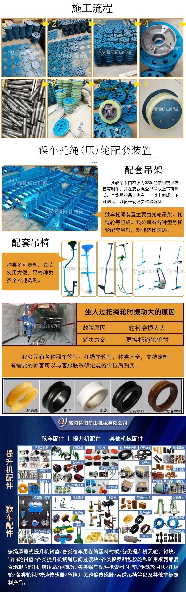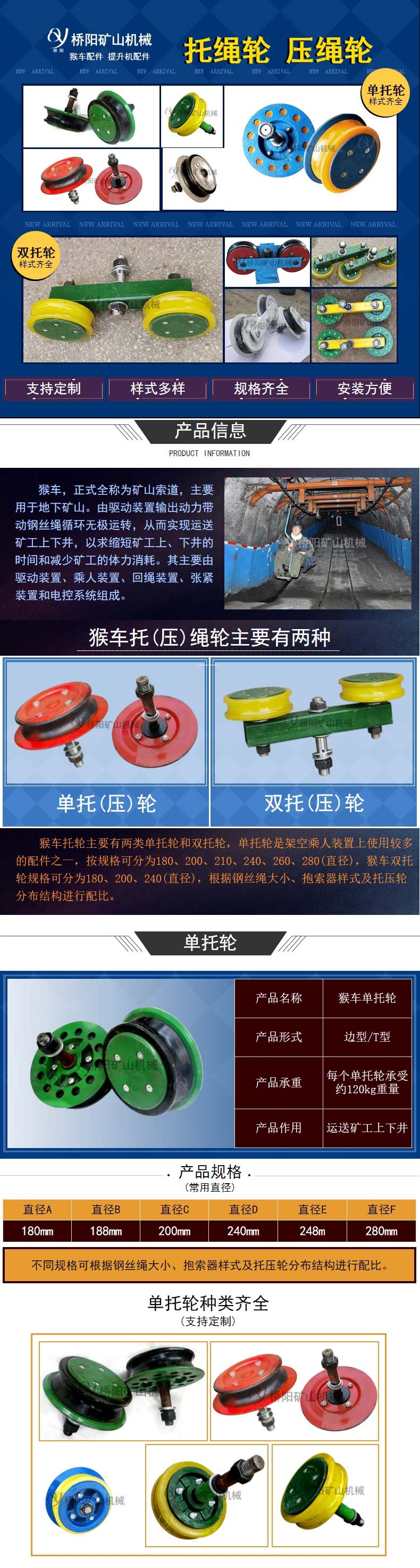 猴车托轮主要有两类单托轮和双托轮,猴车双托轮规格可分为直径180、直径200、直径240三种不同规格,根据钢丝绳大小、抱索器样式及托压轮分布结构进行配比。猴车单托轮和双托轮生产,品种、规格,猴车整机到配件及辅助材料配套,支持定制。