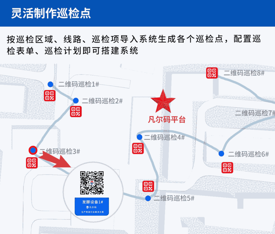 通过凡尔码平台实现消防防火巡查系统搭建,将防火巡查点罗列生成二维码,粘贴现场;微信扫一扫即可实现巡查管理;