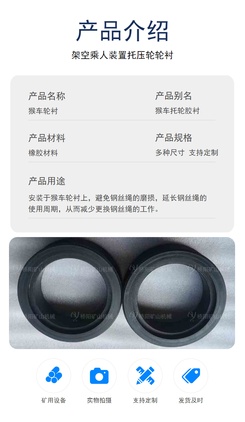 架空乘人装置(猴车)轮衬,又称为衬套,按村质可分为五大类,聚胺酯(黄色)、橡胶(黑色)、工程塑料(青灰色)、尼龙轮衬和复合材料轮衬。目前主要采用的橡胶材质居中多,因其材质较软,乘坐舒适度比较好。