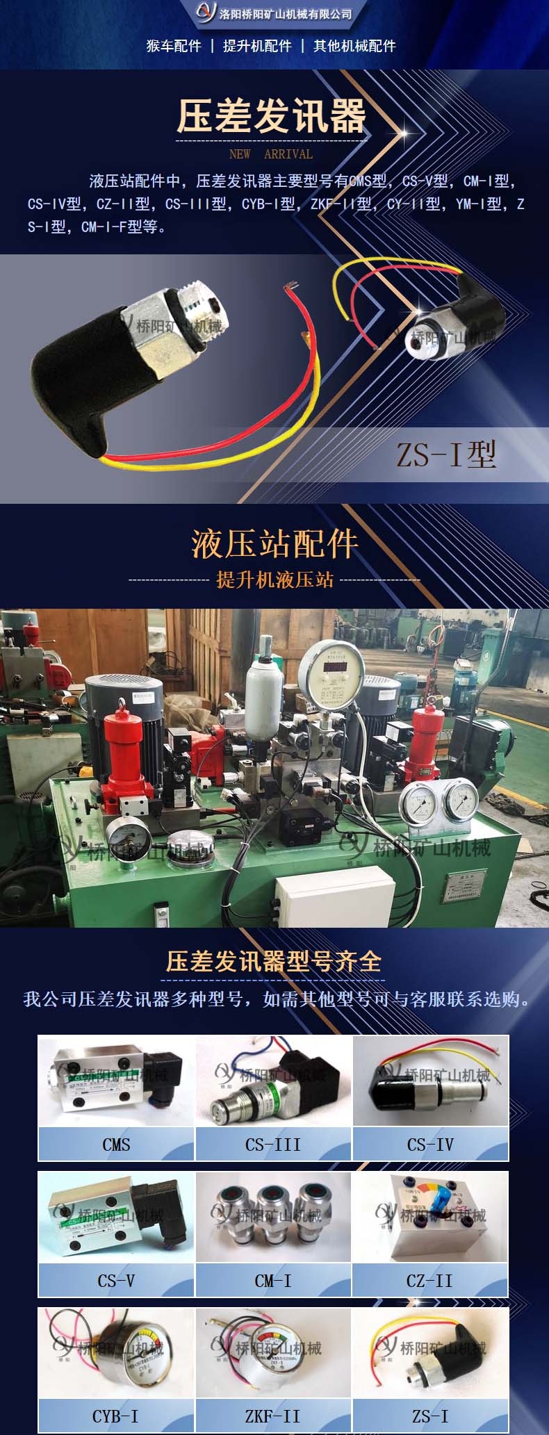 洛阳桥阳矿山机械有限公司生产的压差发讯器型号齐全,主要有CMS,CS-V,CM-I,CS-IV,CZ-II,CS-III,CYB-I,ZKF-II,CY-II,YM-I,ZS-I,CM-I-F等。洛阳桥阳矿山机械有限公司生产ZS-I型真空压力式发讯器,连接螺纹是M18×1.5。这款压力发讯器是用来借助吸油过滤器配套保护油泵的配件。