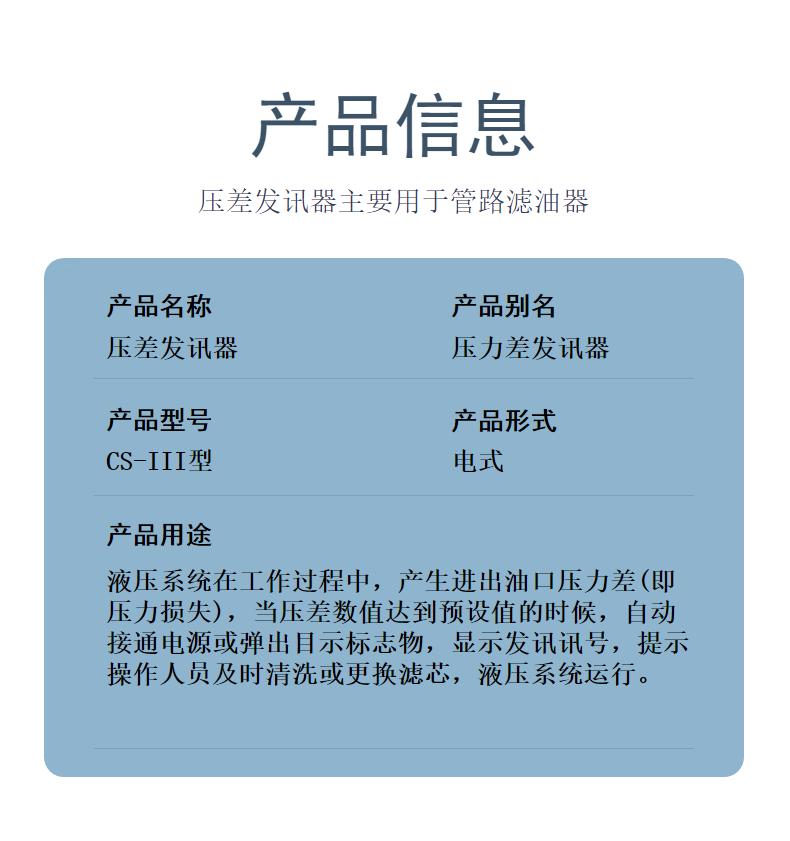 生产的CS型压差发讯器,具备诸多优点:在液压系统启动或瞬时流量增减时,不易发出误讯号;不会因碰撞等原因导致原来设定的压差发讯值失准;不但以开关形式发出滤芯堵塞的声音讯号,并可以开关形式切断与液压系统相关的控制电路,达到主机和液压系统正常运行的目的;交直流均可,交流电压达220V。