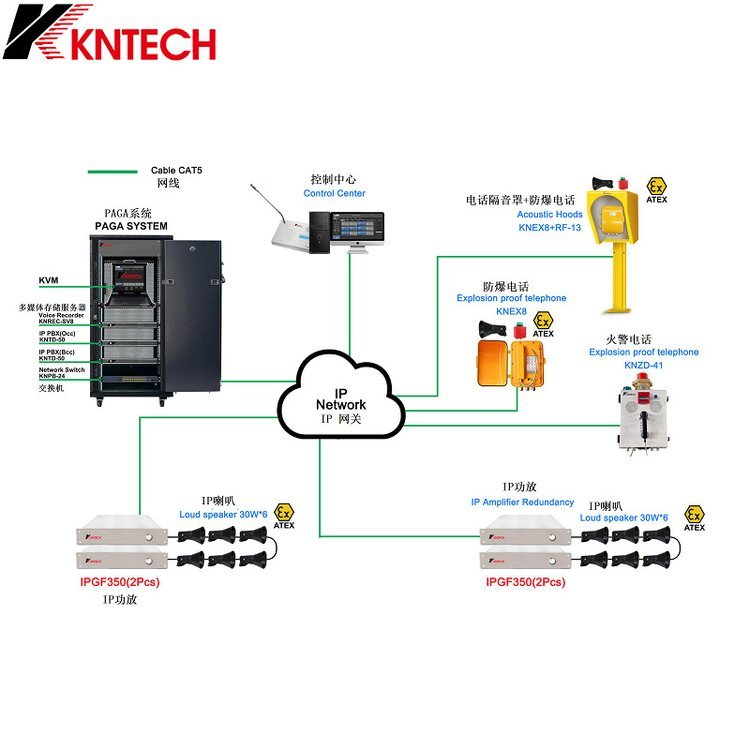 系统描述? 什么是 PAGA 系统?PAGA 系统就是公共广播和通用报警系统,KNTECH 的 PAGA-G3 系统是基于网络传输 SIP2.0 技术,KNTECH 第二代 PAGA-G3 集成了 IPPBX 通信、寻呼、广播、自检、告警、日志、录音和录音文件管理等功能。 系统的功能特点是所有组成部分都具有自我诊断功能,实时监控整个系统健康状态,实时 掌握电话机终端的听筒按键等各部位的健康状态,实时监控各区域的喇叭的健康状态。大大节省维护成本。第二代 PAGA 增加了更智能的 IP 广播能力, 各区域的 IP 功放机可进行网页配置和更新广播文件。人工广播,定时广播,外部 PLC 系统可通过私有协议、MODELBUS 或者 I/O 硬控制触发各种智能广 播。 可通过网页远程线上配置对 IP 功放机进行分组广播和分区域广播,操作便捷。?? 本系统具有灵活的多级权限管理,用户可根据项目需要配置各级用户的使用权限。权限包括拨打内线外线电话,强拆,强插,呼叫队列,坐席呼叫转移, 分区分组广播,日志查看,录音站点选择录音文件下载等。??本系统安全可靠,PAGA-G3 主机 IP PBX 为冗余备份系统,OCC 主机和 BCC 备机时实同步所有呼叫和录音记录。各终端和 IP 功放机与 IP PBX 系统实时心跳 检测和自动对接。IP 功放机也是冗余备份。即使在断网的情况下也可以通过 IP 功放机自有的 PTT 手持麦克风对本区域进行人工广播喊话。?PAGA-G3 组成PAGA-G3 包括三个部分:(1) 主控制主中由 IP PBX 主机 OCC 和 IP PBX BCC 备机组成的冗余备份系统。录音服务器系统 SV8。 通过 KVM 随意调换管理所有服务器。(2) PAGA 广播调度中心,包括带有网页在线软件的 PC 机和广播调度台。(3) 各区域包括 IP 功放机和喇叭,声光报警装置,紧急防水/防爆电话等。?PAGA-G3 功能(1) 公共广播功能? 主要功能是调度人员或工作人员通过控制中心或任何电话站或者 IP 功放机输入广播语音信息,将通过网络转输到各站点的喇叭进行广播。 通过各 区域的 IP 功放机进行分组或者分区广播。广播方式分为人工广播和自动广播,人工广播就是人工喊话实时发起广播,自动广播是通过系统网页界 面设置好的指令和预先存储好的广播自信自动按时广播。(2)常规告警? 该功能主要是播放常规报警信息。 当区域内发生紧急情况时,员工可以触发相应的警报装置联动系统广播告警,以使员工进行相关的紧急操作。 PAGA 系统 IP PBX 服务器内存储有 30 多种告警音频,与此同时,它为其他系统提供多个接口,用于警报启动/警报结束。 同时,可以为每个控 制站的按钮编程不同的警报启动(例如,火灾警报,气体警报,放弃警报)以及警报结束功能。 系统的 GA 功能如下: --警报音可以从中央控制中心调度台或者各 I / O 接口启动/停止 --可编辑的警报音存储在 IP PBX 服务器中 --各个子控制站可通过本站 IP 功放机 I/O 触发警报音对本区域进行告警?(3)IP PBX 电话调度功能强大的 PAGA-G3 系统包括 IP PBX 系统电话调度和会议功能。 包括紧急呼叫,紧急对讲,如果配有可视电话机可实现可视对讲,调度功能。 在日常工作 3 中,需要与其他工作人员沟通或遇到紧急情况可以使用紧急对话,包括一键触发对全体站点发起全呼,一对一单个呼叫,分区或者分组呼叫功能。 控制 中心人员在权限开启的情况下可以强行拆除分机的通话,强行插入分机之间的通话,系统具备通用型 IP PBX 功能包括:呼叫队列,坐席转接,呼叫转转 移,呼叫记录查询,监听,录音等。(4)IP 功放功能? 每个区域都配备了 IP 功放机,该放大器由中央调度员直接网页界面远程线上配置和管理,并带有手持麦克风 PTT 接口,可在网络故障时进行广播。 通过 I / O 输入和输出触发本区域广播和告警。(5) 带自检功能的喇叭? 每个带 IP 放大器的区域都直接连接扬声器。 PAGA-G3 系统管理器可以通过网络监视和显示所有扬声器电路/放大器故障或工作状态数据。 每个扬声器都 有独立的地址代码。 昼夜自诊断和实时故障报告功能。(6)录音存储服务器? 录音存储服务器 SV8 是基于 LINUX 系统的服务器带网页操作管理界面,可通过网页用户名和密码登录网页界面对系统的所有呼叫和广播记录进行实时录 音和存储录音文件,可直接在网页界面对录音文件进行播放、查询、批量管理和批量下载。SV8 录音服务器具有自我空间管理和系统诊断以及告警功能。??PAGA-G3 应用领域? 应用领域:油气勘探和生产平台,浮式储油卸油 (FSO)、浮式生产储油卸油 (FPSO)、液化天然气 (LNG) 和石油船,陆上油气加工厂,包括油气码头、石化炼油厂和电力公司, 船舶、海上钻井平台、海洋平台、炼油厂,石油,石化,天然气,火电,核电,冶金,和含有易燃易爆气体的危险场所,高噪音,腐蚀,粉尘,等场所,电磁辐射强和干扰 性强等恶劣工作环境都需要安装 PAGA 公共广播和通用报警系统.?? 香港昆仑科技产品为高危险应用场景设计,产品通过国际 TUV 认证机构 ATEX 和 IECEX 认证,产品为国际标准防爆级别,为用户实现在潜在爆炸性环境中实现安全语音和 报警和广播功能。系统采用统一通讯融合 IPPABX 电话系统和 PAGA 系统(公共广播和通用报警系统),当发生紧急情况或者其他特殊情况时,需要对大范围的区域进行喊话广播或 者报警等功能,各区域电话机通过 SIP 服务器集成 PAGA 系统统一通讯,就可以实现对 PAGA(公共广播和通用报警系统)系统进行大范围的区域进行喊话广播或者报警等功能。
