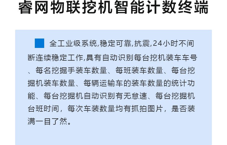 ????睿网物联挖机智能计数终端采用云计算结合物联网技术进行信息采集和数据分析,通过照片留证的方式降低人为误差的影响,数据自动采集,大大降低了外部因素对数据客观准确性的干扰,也降低了数据采集和统计的工作量。同时前端设备信息实时同步也让挖机作业情况随时随地可查,从而解决挖机管理中存在的各种问题。
