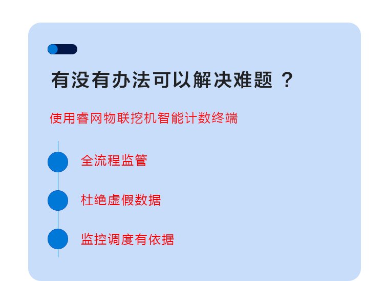 ????睿网物联挖机智能计数终端采用云计算结合物联网技术进行信息采集和数据分析,通过照片留证的方式降低人为误差的影响,数据自动采集,大大降低了外部因素对数据客观准确性的干扰,也降低了数据采集和统计的工作量。同时前端设备信息实时同步也让挖机作业情况随时随地可查,从而解决挖机管理中存在的各种问题。