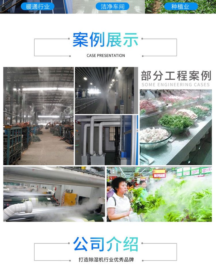 应用领域超声波加湿器适用较小加湿量及负荷标准不错,需全气化标准下,部分加湿应用。纺织业:针织厂环境湿度操纵,静电消除及除尘。造纸业:纸型的环境湿度操纵,静电消除及除尘。计算机机房:各种计算机房的环境湿度操纵及静电消除。电子产业:半导体元器件厂、LCD厂、PCB厂、IC检测厂等环境湿度操纵及静电消除。喷漆制造行业:汽车涂装厂、各种喷涂厂的环境湿度操纵,静电消除及除尘。电子行业:塑胶注塑成型厂、塑胶产品生产厂环境湿度操纵及静电消除。炸药制造行业:炸药生产制造、填装、做成、存储静电消除。包装印刷制造行业:塑料印刷、精致包装印刷、独特包装印刷环境湿度操纵及静电消除。试验室:各种检测、检验、品质、剖析、化学实验室自然环境控湿。烟草行业:香烟生产加工、生产制造环境湿度操纵及除尘。暖通行业:家用中央空调加湿,计算机房家用中央空调加湿及静电消除。冷藏贮藏:果疏商品控湿冷藏、贮藏。食品企业:干躁、脱干食品类反潮、冷藏。农业:产业化养殖食用菌、盆栽花卉、热带雨林植物及无土栽培技术等环境湿度操纵。养殖行业:家畜、飞禽、虫类等产业化饲养保湿补水及消毒杀菌。人工服务园林景观:亚热带人工服务热带雨林、影视制作、展览会等效仿地理环境云雾缭绕园林景观。